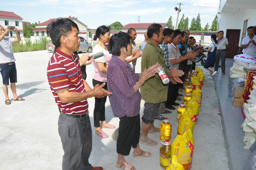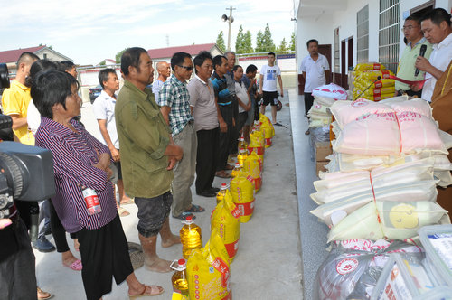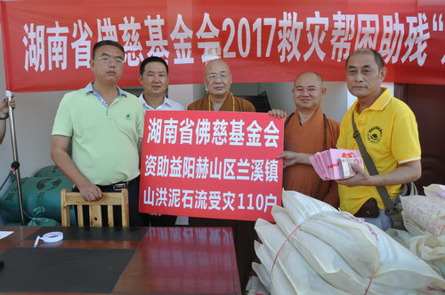 在益阳市赫山区兰溪镇受灾现场,湖南省佛慈基金会给予110户遭受严重洪涝灾害的村民,每户发放现金400元,以及大米一袋,食用油一桶。另还捐助了夏桑菊2件、空调薄棉被100床、肤保112瓶、急救药箱110套,此次共捐赠善款物资合计8.85万元。