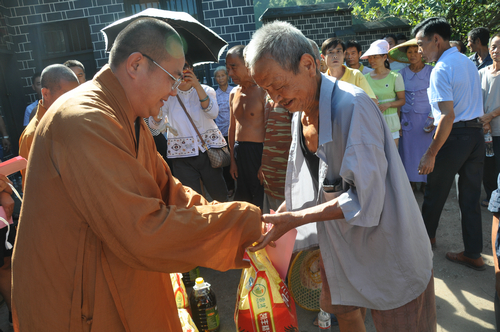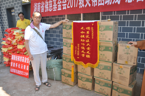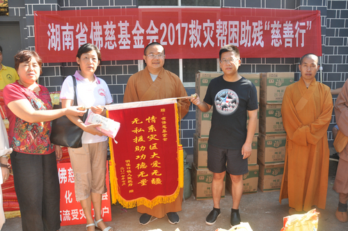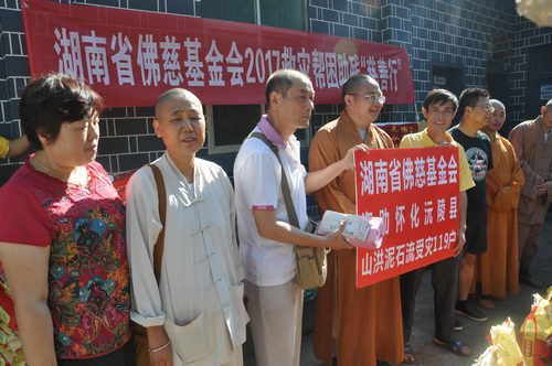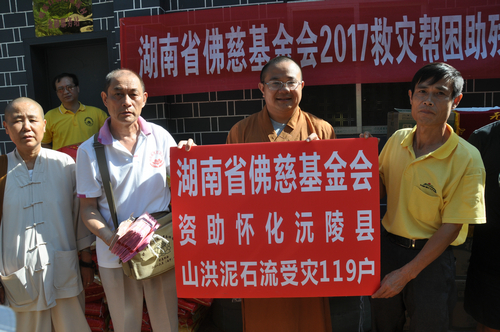 2017年7月23日上午,怀化佛教协会会长登宁法师、湘西州佛教协会会长芳慧法师受中国佛教协会副会长、湖南省佛教协会会长、湖南省佛慈基金会会长圣辉大和尚的委托,带领湖南省佛慈基金会秘书长周仲山、办公室主任曹银艳、工作人员李长辉等一行人,来到湖南佛教慈善行第十六站,沅陵县民溪口镇胡家溪村、高砌头村、浪潮村赈灾。