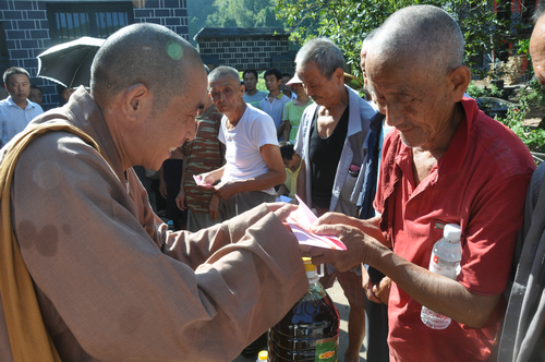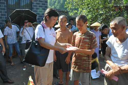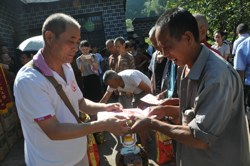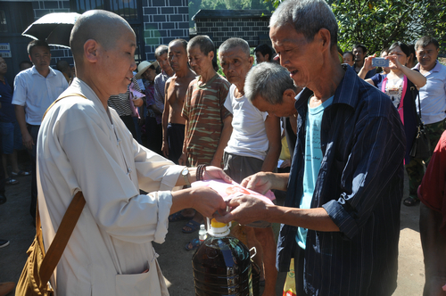 在沅陵县民溪口镇胡家溪村捐赠现场,湖南省佛慈基金会给予119户遭受严重洪涝灾害的村民,每户发放现金400元,以及大米一袋,食用油一桶,同时捐赠了150件新衣,此次共捐赠善款物资合计7.688万元。
