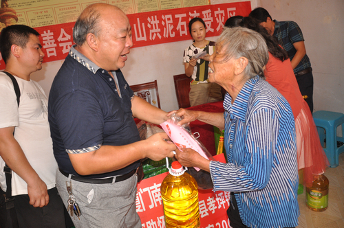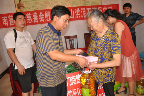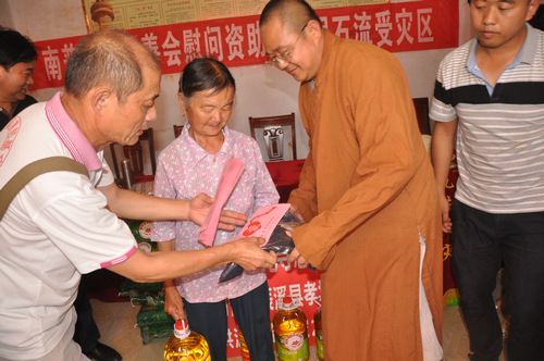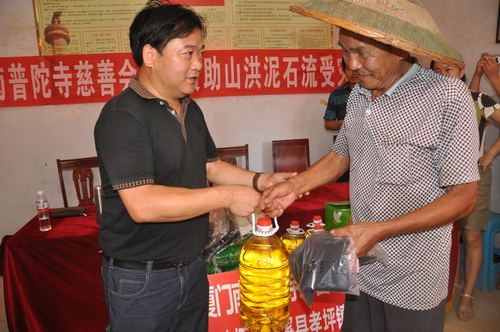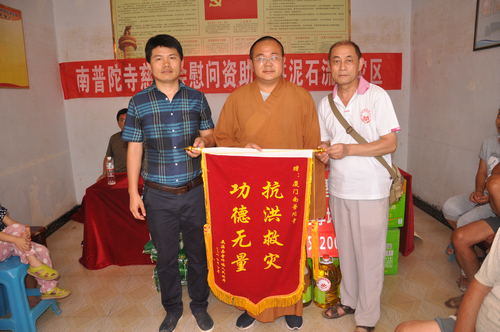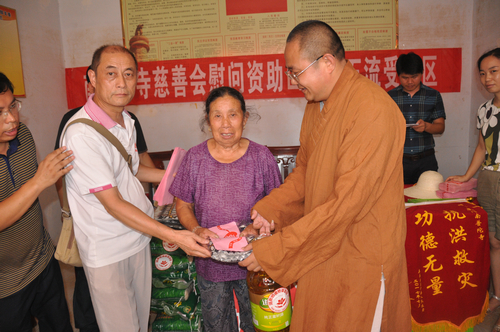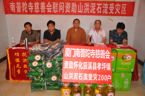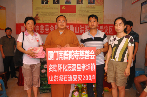 在辰溪县孝坪镇当江洲村捐赠现场,厦门南普陀寺慈善会委托湖南省佛慈基金会给予200户遭受严重洪涝灾害的村民,每户发放现金400元,以及大米一袋,食用油一桶,共捐赠10.4万元。同时湖南省佛慈基金会捐赠了250件新衣,此次共捐赠善款物资合计12.9万元。