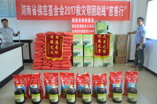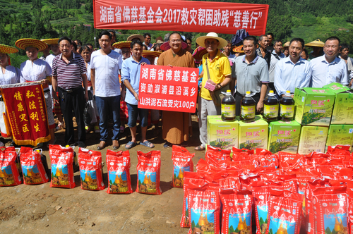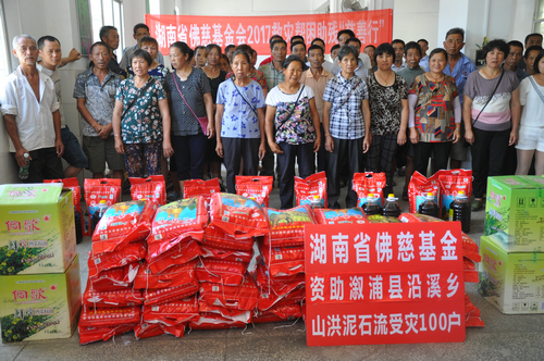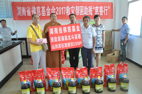 2017年7月24日,怀化佛教协会会长登宁法师、受中国佛教协会副会长、湖南省佛教协会会长、湖南省佛慈基金会会长圣辉大和尚的委托,带领湖南省佛慈基金会秘书长周仲山、办公室主任曹银艳、工作人员李长辉等一行人,来到湖南佛教慈善行第十八站,怀化地区溆浦县北斗溪镇和沿溪乡赈灾。