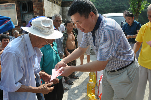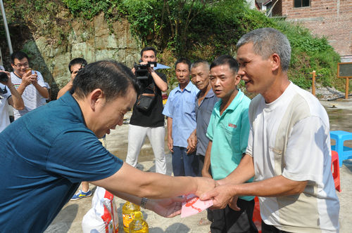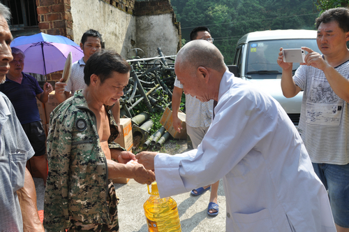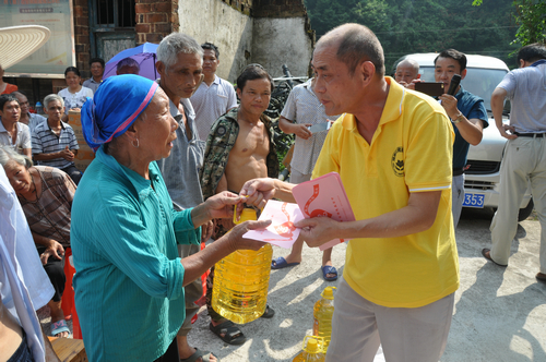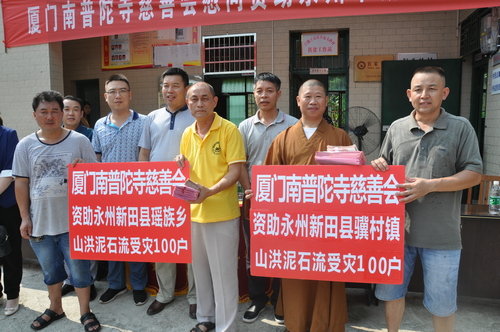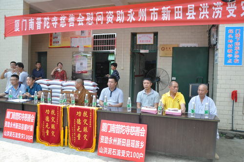 在永州新田县骥村镇和门楼下瑶族乡捐赠现场,湖南省佛慈基金会给予遭受严重洪涝灾害的新田县骥村镇100户村民和新田县瑶族乡100户村民,每户发放现金400元,以及大米一袋,食用油一桶。此次共捐赠善款合计10.4万元。