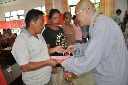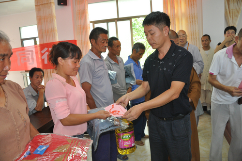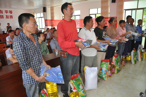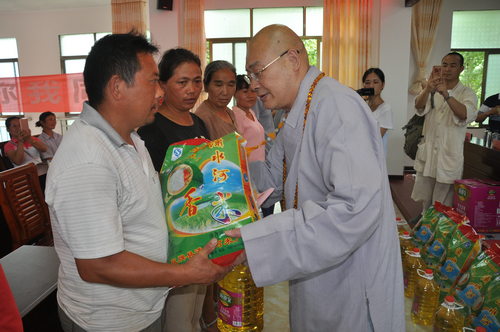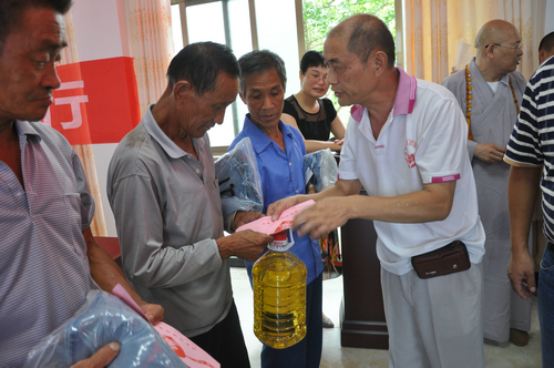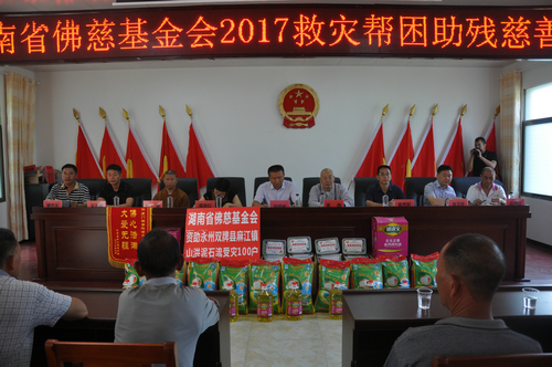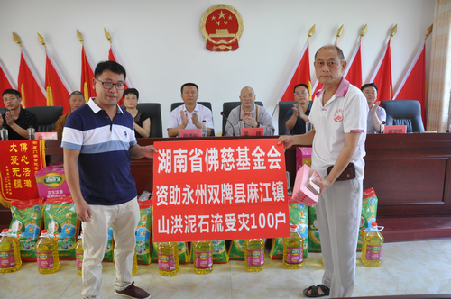在永州双牌县麻江镇政府办公楼的捐赠现场,湖南省佛慈基金会给予双牌县麻江镇、茶林镇、塘底乡共100户遭受严重洪涝灾害的村民,每户发放现金400元,以及大米一袋,食用油一桶。另捐助新衣140件,捐赠药套31大盒,此次共捐赠善款物资合计6.6万元。