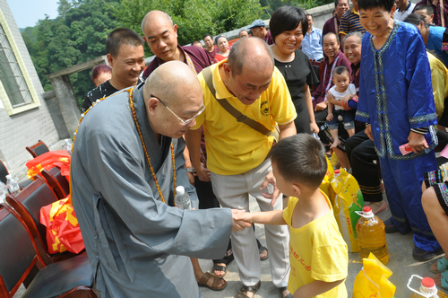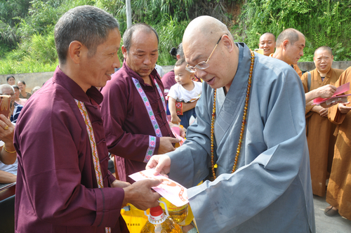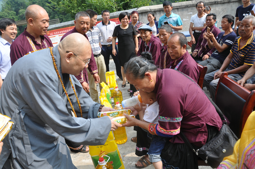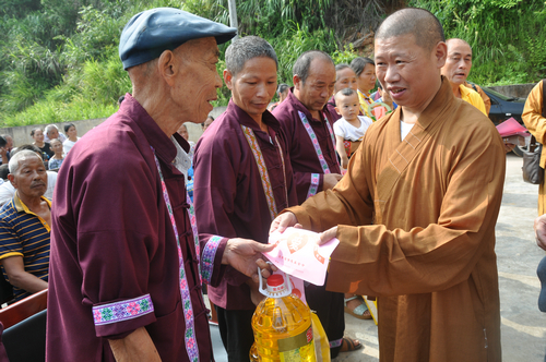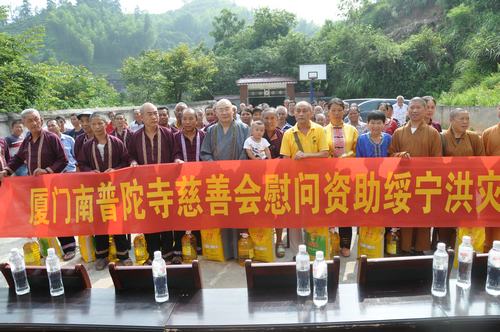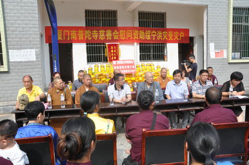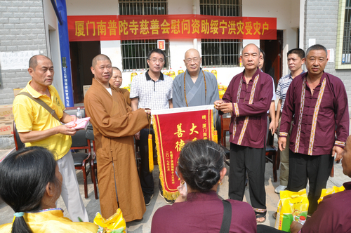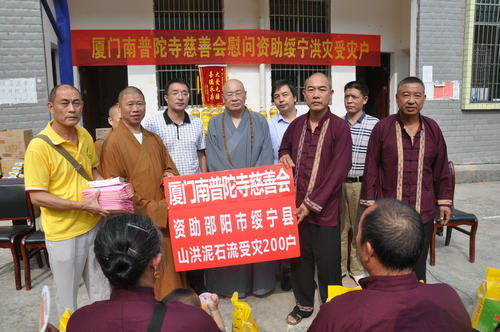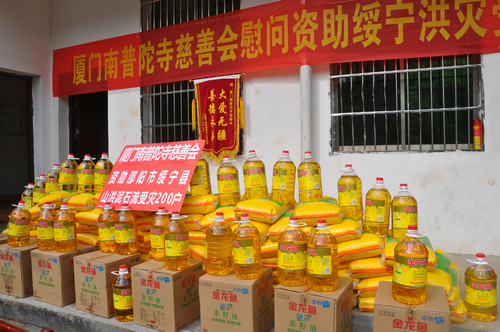 在邵阳绥宁县长铺子苗族侗族乡芷坪村的捐赠现场,南普陀寺慈善会委托湖南省佛慈基金会给予绥宁县长铺子苗族侗族乡芷坪村,共200户遭受严重洪涝灾害的村民,每户发放现金400元,以及大米一袋,食用油一桶,邵阳市佛协捐助了16件饼干,此次共捐赠善款物资合计10.6万元。
