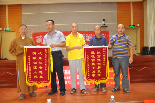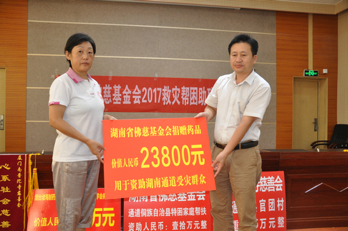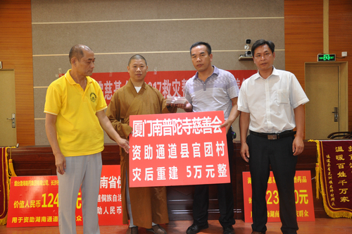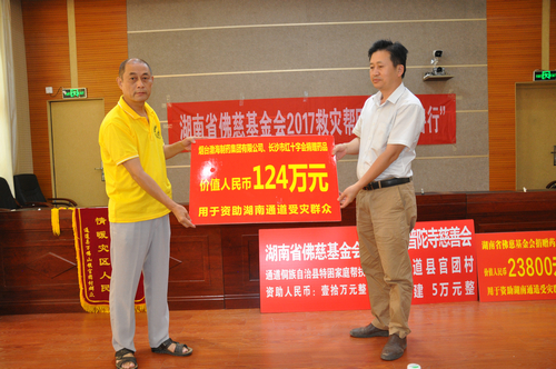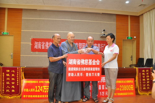 湖南省佛慈基金会在通道县政府办公楼内举行了捐助仪式,给予通道县侗族龙坪村特困户发展产业资助10万元,另厦门南普陀寺慈善会捐给通道县官团村100户遭受严重洪涝灾害的村民,资助灾后大棚蔬菜基地重建善款5万元。同时烟台天正药业有限公司、烟台渤海制药集团有限公式联合长沙市红十字会以及省佛慈资助了药品24大件和200件价值124万元的非处方药,此次共捐赠善款以及物资合计141.38万元。