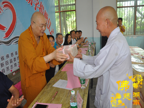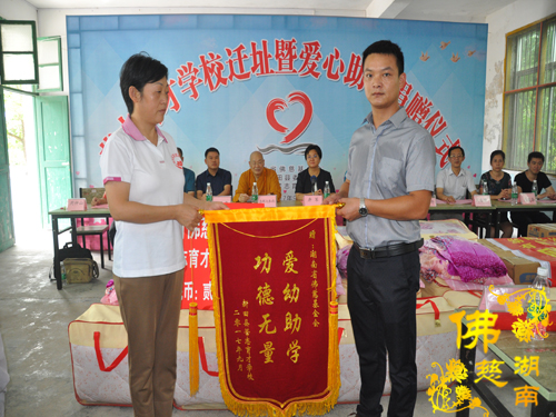 在新田县原莲花中学现苦志育才学校的新校址里,首先由圣辉大和尚、湖南省红十字会党组成员、副会长王广宇、省委统战部民宗处处长彭天忠和新田县委书记唐军在新学校的大门口举行揭牌仪式,湖南省佛慈基金会向苦志育才学校捐助20万元助学基金。随后,举行了简短而庄严的捐助仪式。在捐助仪式上,新田县委书记和省委统战部民宗处处长彭天忠在会上作了重要讲话,他们高度赞扬了圣辉大和尚对苦志育才学校的创办和大力支持,认为苦志育才学校才有了现在的规模,是社会各界爱心人士给予大力关怀支持的结果。