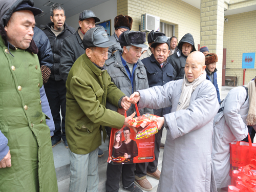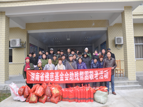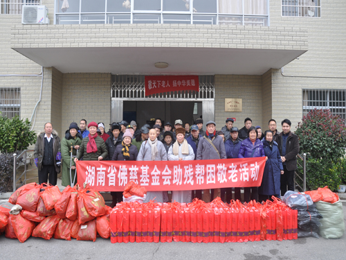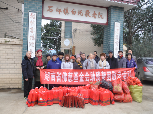 2018年1月30日上午,受湖南省佛慈基金会会长圣辉大和尚的嘱托,湖南省佛慈基金会周仲山秘书长在冰冻的寒冷天气里,带领省佛慈工作人员前往湘潭市,在年关即将到来之时联合湘潭市佛教协会昌雪法师、妙提法师,向湘潭县三个敬老院的孤寡老人,给予慰问和资助,送去了营养药品、保暖内衣、防寒棉衣等物资。
