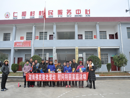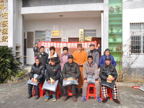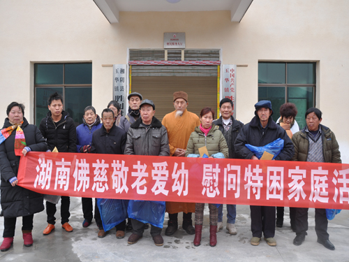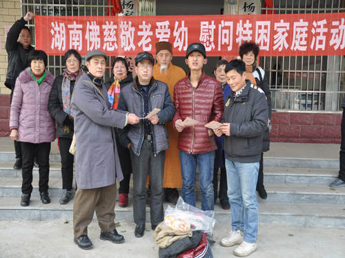 2018年2月2日上午,湖南省佛慈基金会周仲山秘书长受湖南省佛慈基金会会长圣辉大和尚的嘱托,带领湘阴县众居士、会员前往湘阴县资助本县三个村特困户。一行人首先到湘阴县东塘镇坝桥村资助8户特困户、到杨家山社区资助5户特困户,又到鹤龙湖镇仁和村资助7户特困户、然后到玉华镇胜利村资助6户特困户,新泉资助1户,川山资助1户,分别慰问资助三个村特困户,共28户特困家庭,共捐物资现金计 1.68万元。