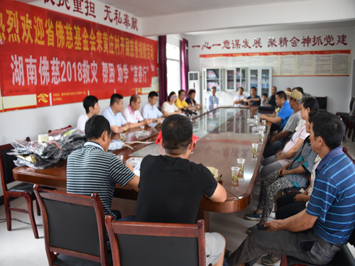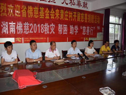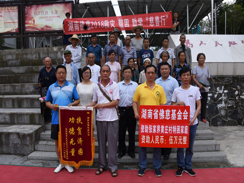 2018年7月14日,受湖南省佛教协会会长、湖南省佛慈基金会会长圣辉大和尚的委托,湖南省佛慈基金会周仲山秘书长、办公室主任曹银艳、工作人员李长辉等一行人,来到湖南佛教2018慈善行第十八站,资助张家界市永定区天门山镇黄庄村高家湾组、王家湾组、垭上组、堰湾组、王家边组等村组里的特困家庭5万元,另给予新衣30件,物款折合共捐5.3万元