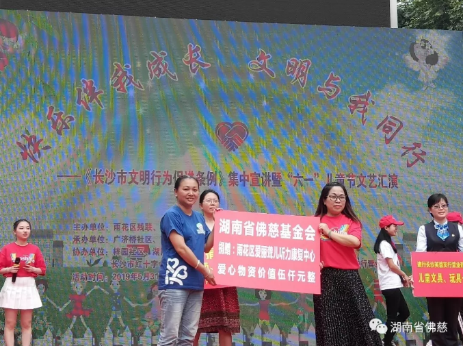 2019年5月31日湖南省佛慈基金会携手雨花区爱丽听力康复中心,与雨花区侯家塘街道广济桥社区共同举办了一场“快乐伴我成长,文明与我同行”“六一”儿童节活动。陪伴一群可爱的听障宝宝们共度六一,通过弘扬志愿者精神,践行扶残助残行为,不断践行基金会关爱儿童,扶残助困的宗旨。