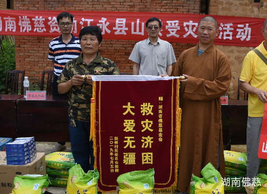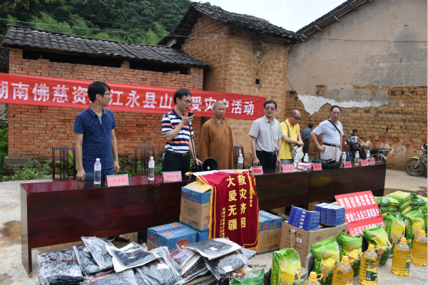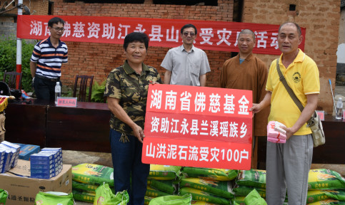 2019年7月5日下午,湖南省佛教协会副会长、湖南省佛慈基金会副理事长怀泉法师、湖南省佛慈基金会周仲山秘书长、常务副秘书长陈旭、工作人员李长辉等一行人,受湖南省佛教协会会长、湖南省佛慈基金会理事长圣辉大和尚的委托。在完成了临武县南强镇洪灾赈济任务后,在永州市统战部刘志刚部长及工作人员的的引导下,前往永州市江永县兰溪瑶族乡新桥村开展洪灾赈济活动。