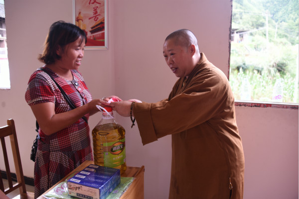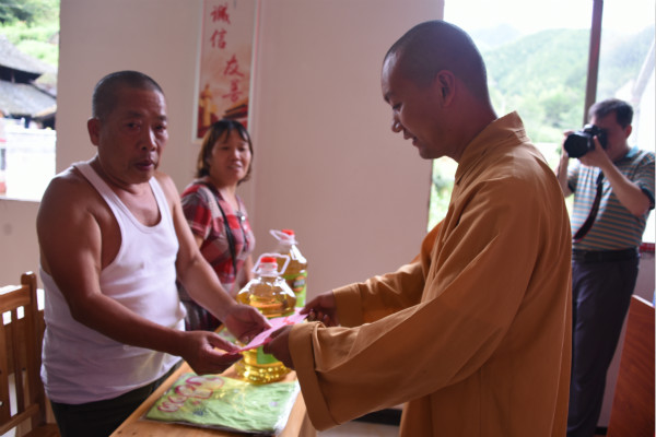 捐赠长铺子镇镇长杨英现场向大家介绍了该镇自6月以来的受灾情况;湖南省佛慈基金会秘书长周仲山,向大家转达了理事长圣辉大和尚的亲切问候和衷心的祝福,希望全体受灾群众能够勇敢面对,积极配合镇党委、镇政府领导下的灾后重建工作。同时还向受灾群众说明了捐赠款物的来源和具体情况。随后湖南省佛慈基金会向长铺子镇拓丘田村200户受灾家庭,每户捐赠善款400元,累计8万元;另外还捐赠了包括新衣物、大米、食用油、清凉油、保健药品等价值62750元的爱心物资;同时,邵阳市佛教协会会长释志东法师还带来了邵阳佛教界爱心人士捐赠的1万元现金。本次捐赠款物累计152750元。举行过简单的捐赠仪式后,大家现场逐一把慈善款物送到了受灾群众手中。