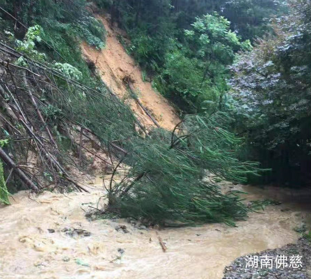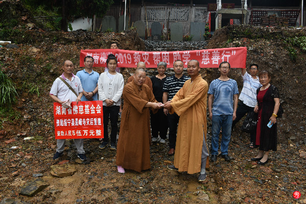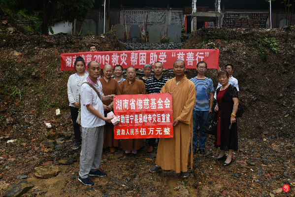 2019年7月7日下午,正值湖南省佛慈基金会执行“2019年湖南佛慈救灾帮困助学慈善行”途中,得知最峰寺的受灾情况后,基金会副会长兼秘书长周仲山、常务副秘书长陈旭、工作人员李长辉等一行人,受湖南省佛教协会会长、湖南省佛慈基金会理事长圣辉大和尚的委托。不辞辛劳,跋涉前往了邵阳市绥宁县长铺子镇最峰寺。并现场捐赠了灾后重建款5万元,同时,邵阳佛教协会会长释志东法师也代表邵阳佛教界爱心人士向最峰寺捐赠1万元善款。本次捐赠款物累计6万元。