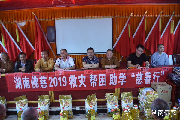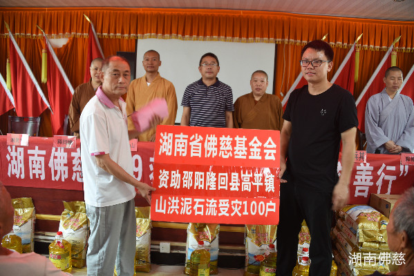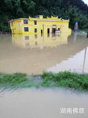 一方有难、八方支援!闻知灾情发生后,受湖南省佛教协会会长、湖南省佛慈基金会理事长圣辉大和尚的委托。2019年7月8日中午,湖南省佛慈基金会副会长兼秘书长周仲山、常务副秘书长陈旭、工作人员李长辉等一行人,虽然正好遭遇再次来袭的强暴雨,大家依旧不畏辛劳,冒着瓢泼大雨,驱车近5个小时赶到了邵阳市隆回县高平镇。