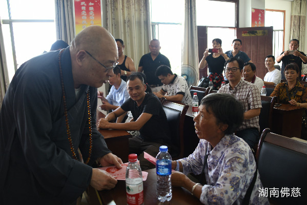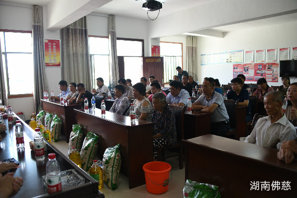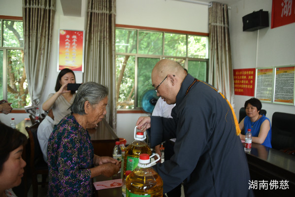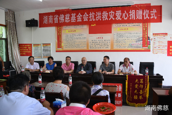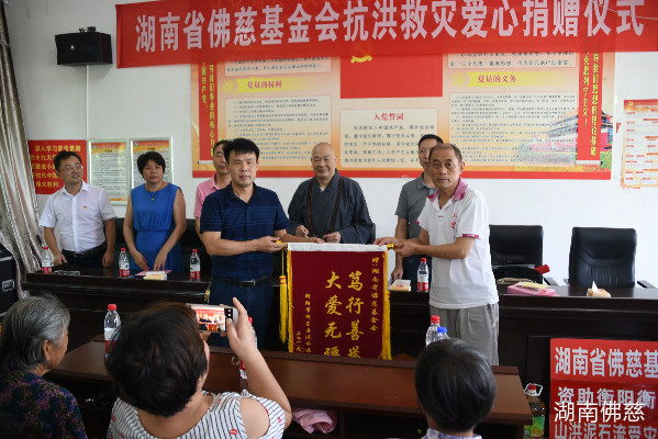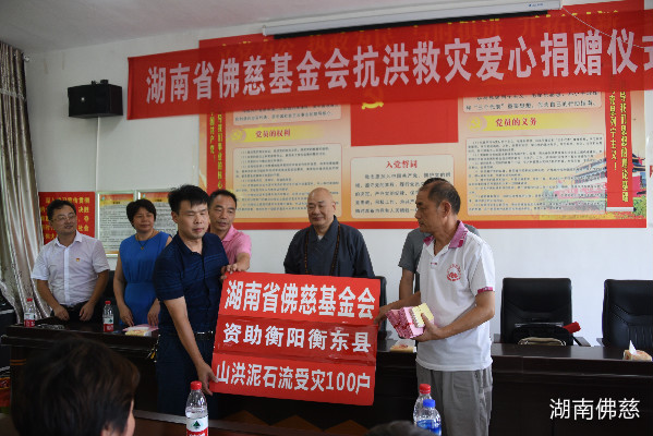 大灾面前有大爱,在社会各界凝心聚力开展抗洪救灾之际,湖南省佛慈基金会为了支持衡东县洣水镇的灾后恢复工作,2019年7月27日下午,湖南省佛教协会会长、湖南省佛慈基金会理事长圣辉大和尚,率湖南省佛慈基金会的工作人员,在完成醴陵市仙岳山街道南门社区的捐赠活动后,不顾酷暑,持续驱车3个多小时,赶到了衡东县洣水镇。为该镇受灾特别严重的金峨、大甸、北冲三个村100户特困且受灾的群众,分别捐赠每户400元现金和一袋米一壶油。