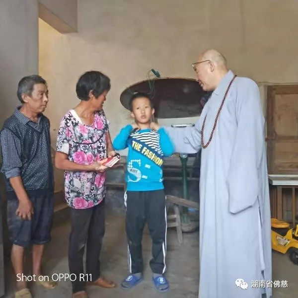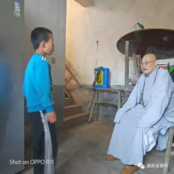 圣辉大和尚听到周菊华奶奶和她孙子的困境后,想到再过三天就是祖国七十年华诞,举国同庆!而祖国是我们每个人的母亲,生活在祖国大家庭的每个人不但都能得到母亲的关爱,而且在祖国母亲大家庭生活着的每个人都要能互相帮助。所以扶贫济困,除开政府进行救助外,也是社会一方有难八方支援的传统美德、又是国家每个公民的社会责任。为了尽社会责任,弘扬佛教慈悲济世的菩萨精神,于是圣辉大和尚带着六千元钱来到谢家交给周奶奶,作为祖孙两人下半年的生活费。并向周菊华奶奶许诺承担她孙子今后读初中、高中,或者她孙子能考上大学,乃至成人前的费用,让她的孙子成人后,能很好的报效祖国。同时对她为了把孙子拉扯大吃了这么多的苦,表示敬意。