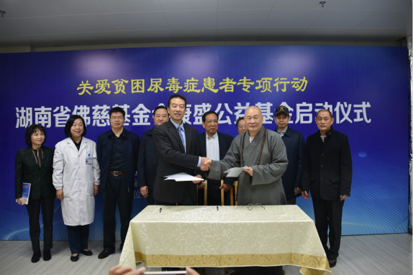 省民政厅、长沙市委统战部、中南大学等有关部门负责人及专家,中国佛教协会副会长、湖南省佛教协会会长、省佛慈基金会理事长圣辉大和尚等出席启动式。圣辉会长当场表示,从今年开始连续5年,他个人每年捐献2万元、省佛慈基金会每年捐献8万元,两项5年共计50万元,与此次广州康盛公司捐献的款物一同用于救助肾衰尿毒症等危急重症贫困患者。