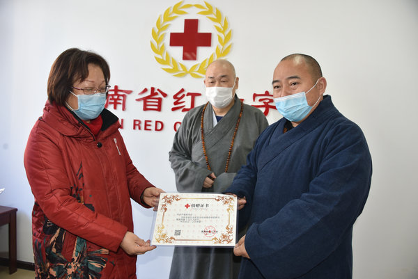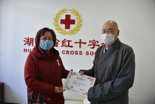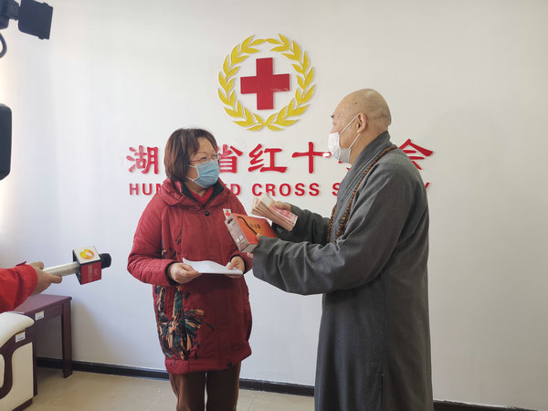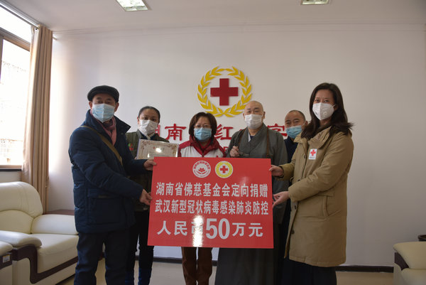 在新春佳节阖家团聚之际,新型冠状病毒感染的肺炎疫情牵动着全中国人民包括我们佛教徒在内的心。1月25日农历大年初一,中央政治局常委会召开会议,对疫情防控进行再研究、再部署、再动员。习近平总书记作出重要指示,强调必须坚持把人民群众生命安全和身体健康放在第一位,坚决遏制疫情蔓延势头。疫情就是命令,防控就是责任。为坚决贯彻习近平总书记重要指示精神,落实中央和省、及各级党政部门关于疫情防控工作部署,发挥好我们湖南佛教界为国家分忧、解人民苦难的优良传统,湖南省佛教协会圣辉大和尚第一时间向全省各寺院僧众和居士信众发出了倡导。南岳佛教协会、长沙市佛教协会、湘潭市佛教协会、株洲市佛教协会、南岳上封寺成为了第一批积极响应的单位,其中南岳佛教协会率先捐赠30万、其它单位分别捐赠5万元,累计人民币50万元。1月28日上午,由圣辉大和尚亲自率领湖南省佛慈基金会工作人员一起,将善款送到了湖南省红十字会,委托转赠到武汉用于支持新型冠状病毒感染的肺炎防控工作。省红十字会常务副会长陈丹萍现场接受了捐赠。