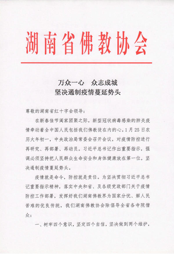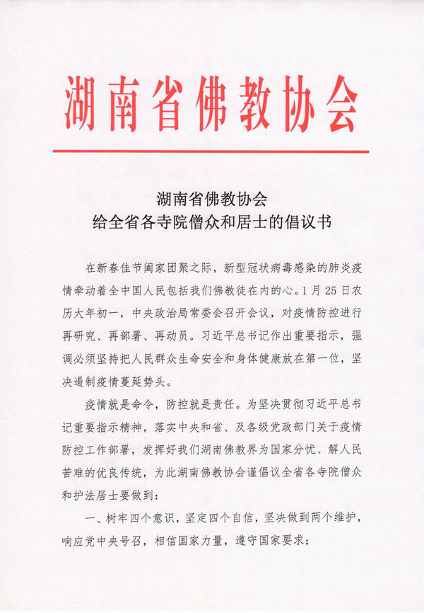 湖南省佛教协会给全省各寺院僧众和居士的倡议书