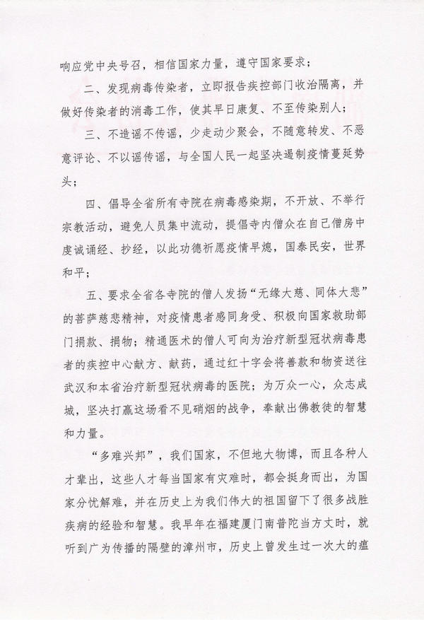 五、要求全省各寺院的僧人发扬“无缘大慈、同体大悲”的菩萨慈悲精神,对疫情患者感同身受、积极向国家救助部门捐款、捐物;精通医术的僧人可向为治疗新型冠状病毒患者的疾控中心献方、献药,通过红十字会将善款和物资送往武汉和本省治疗新型冠状病毒的医院;为万众一心,众志成城,坚决打赢这场看不见硝烟的战争,奉献出佛教徒的智慧和力量。