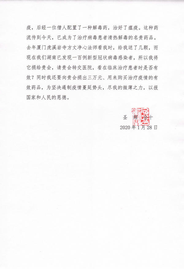 “多难兴邦”,我们国家,不但地大物博,而且各种人才辈出,这些人才每当国家有灾难时,都会挺身而出,为国家分忧解难,并在历史上为我们伟大的祖国留下了很多战胜疾病的经验和智慧。我早年在福建厦门南普陀当方丈时,就听到广为传播的隔壁的漳州市,历史上曾发生过一次大的瘟疫,后经一位僧人配置了一种解毒药,治好了瘟疫。这种药流传到今天,已成为了治疗病毒患者清热解毒的名贵药品。去年厦门虎溪岩寺方丈净心法师看我时,给我送了几颗,而现在我们湖南已发现一百例新型冠状病毒感染者,所以我将它捐给贵会,请贵会转交医院,看在临床治疗患者时是否有效?同时我还要向贵会捐出三万元、用来购买治疗疫情的有效药品,为坚决遏制疫情蔓延势头,尽我的微薄之力,以报国家和人民的恩德。