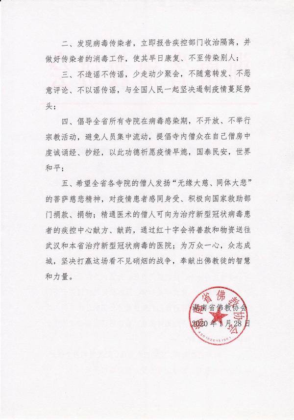 四、倡导全省所有寺院在病毒感染期,不开放、不举行宗教活动,避免人员集中流动,提倡寺内僧众在自己僧房中虔诚诵经、抄经,以此功德祈愿疫情早熄,国泰民安,世界和平;