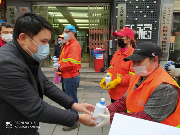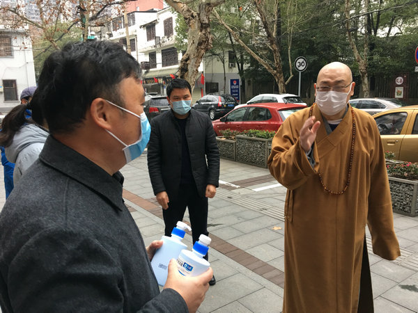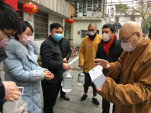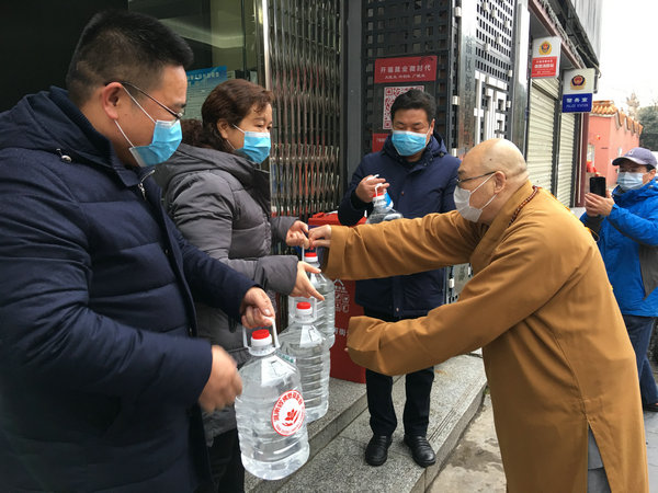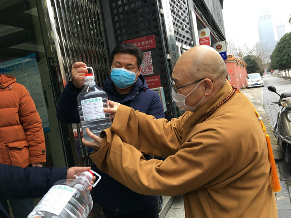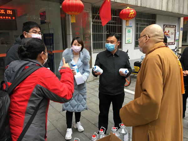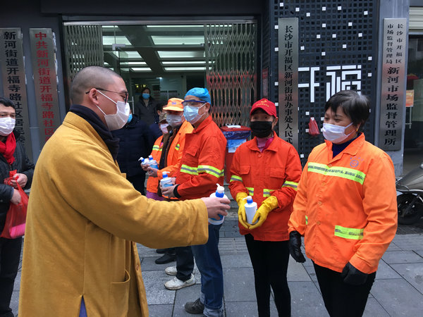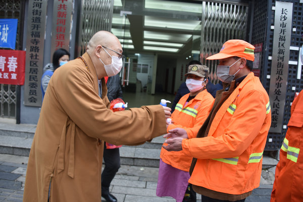 2月7日上午,湖南佛慈基金会再次面向湖南省内将采购到的首批价值35万元,用于抗击新型冠状病毒感染肺炎疫情急需的消毒防疫药品,定向捐赠给省内包括街道社区、社会组织、福利机构、环卫工人、公交公司、交警大队等战斗在防疫一线的部分单位。简短的仪式结束后,基金会工作人员在会长圣辉大和尚率领下、兵分几路,将医用酒精、消毒用品等物资送往环卫工人、街道和指定的各家医院,用于新型冠状病毒感染的肺炎疫情防控阻击战。后续物资到达后也将分批送达,用于支持防疫工作所需,从而用实际行动投入这场疫情防控阻击战,持续帮助社会和广大人民群众更好地防抗疫情。大家坚信,在以习近平总书记为核心的党中央坚强领导下,全国人民齐心协力,坚定信心,就一定能够打赢这场没有硝烟的战役。