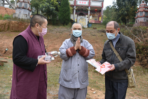 3月13日,圣辉大和尚与中佛协副秘书长、省佛协副会长、岳阳佛协会长怀梵大和尚、以及省佛协副会长、省佛慈基金会副理事长兼秘书长周仲山居士、常务副秘书长陈旭居士、省佛协永觉法师,对湘阴县的南泉寺、法华寺以及湘阴唯一的女众道场华祥寺,汨罗县的资圣寺、崇善寺、保缘寺、平江县的东山寺上下两院展开了“偏远山区中小寺院抗疫慈济行”的第三站。