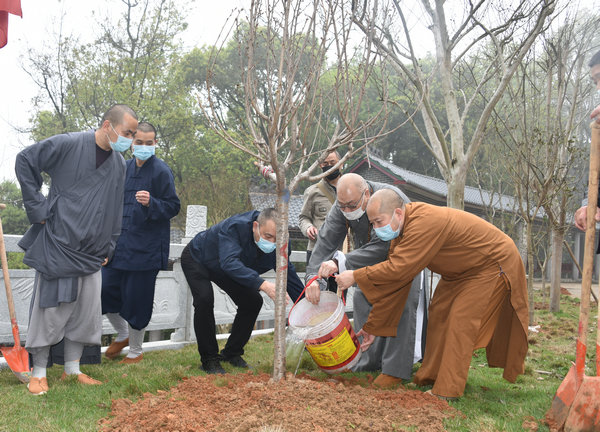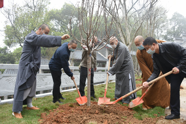 “偏远山区中小寺院抗疫慈济行”的行程结束后,在省佛协副会长兼秘书长、湘乡佛协会长法通法师,省佛协副会长、省佛慈基金会兼秘书长周仲山居士、省佛慈基金会常务副秘书长陈旭居士、省佛协永觉法师、凤凰古寺住持等人的陪同下,圣辉大和尚来到了当代高僧虚云长老的家乡湘乡凤凰古寺的东山顶上。怀着对全国人民在党和政府的坚强领导下,同舟共济、众志成城、齐心抗疫,利好数据不断刷新,国内疫情迅速得到遏制,胜利的曙光就在前面,而国际疫情的严峻形式却在不断加重的时节因缘中,种下了一棵春意浓浓的樱花树!大家虔诚祈祷:世界人民秉持人类命运共同体理念,加强抗疫合作、共克时艰,共同维护全球公共卫生安全,最后彻底战胜疫情!大家一心祝愿:在严冬过后、充满希望的春天里,不但我们伟大的祖国和人民,而且各国人民都能和我们一起品味到百花开放带给世界的芳香!