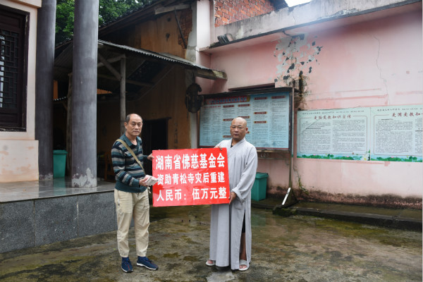 2020年6月23日,湖南省佛慈基金会拉开了“湖南佛慈2020年救灾帮困助学慈善行”的序幕,第一站来到了长沙县金井镇青松寺,这里是长沙县重点佛教活动场所之一。但因寺庙建筑年代久远,在遭遇多日强暴雨天气后,靠近山体的房屋和护坡多处出现了墙体开裂、垮塌、屋面漏雨等现象,存在着巨大的安全隐患。为了进一步改善青松寺的基础条件,消除安全隐患,受湖南省佛教协会会长、湖南省佛慈基金会理事长圣辉大和尚的委托,湖南省佛教协会副会长、省佛慈基金会秘书长周仲山、省佛慈基金会常务副秘书长陈旭来到了青松寺勘察灾情,并送去了五万元的灾后重建善款,希望能够以解燃眉之急。