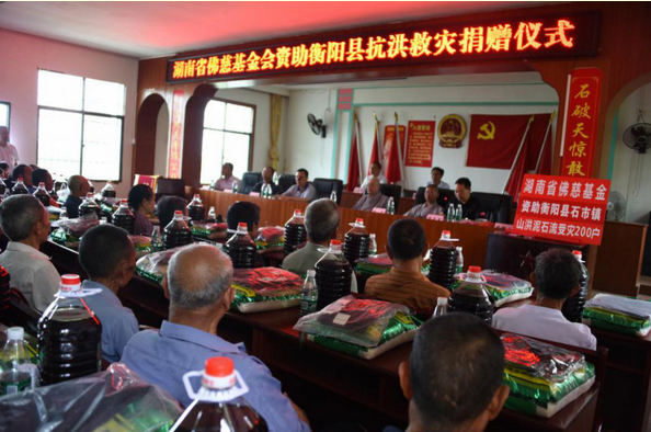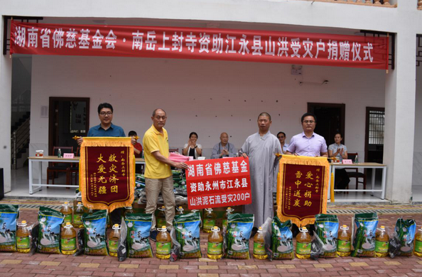 在三地的捐赠仪式上,省佛慈基金会向石市镇灵川、黄门、珍珠、梅树等村200户受灾严重的群众现场发放了每户捐赠救灾款300元及价值120元的米和油,以及包括新衣物在内的捐赠物资,共捐赠善款物资10万余元。向江华县200户受山洪侵袭的受灾群众家庭,共捐出善款10万元。向江永县200户受山洪侵袭的受灾群众家庭,其中源口瑶族线97户,兰溪瑶族乡103户,每户捐赠救灾款300元及价值120元的米和油,以及包括新衣物在内的捐赠物资,共捐献善款10万元。