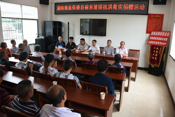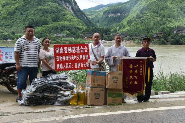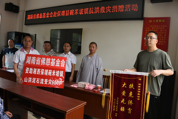 湖南佛协和佛慈基金会得知灾情后,经过与保靖县政府相关部门沟通后,决定捐赠碗米坡镇受灾情影响的家庭600户,每户现金300元,共计善款18万元,以及价值41000元的新衣物和高浓缩消毒片、食用油等物资,还特别为支持碗米坡镇沙湾村灾后重建项目捐款10万元现金,累计捐赠款物达32.1万元。