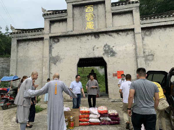 在完成了沱江镇十里牌村的洪灾赈济工作后,省佛慈基金会一行又在凤凰县统战部和宗教局领导的陪同下,来到凤凰县西云庵开展为凤凰县困难寺院的第六站帮扶工作,为困难寺院分发口罩、消毒片、油米等帮扶物资。 深圳市德义爱心促进会副秘书长韩思远、省佛协副会长、省佛慈副理事长兼秘书长周仲山,省佛慈常务副秘书长陈旭,湘西州民宗局副局长田滔、湘西州红十字会常务副会长田否极、赈济服务部符金波部长、中共凤凰县委常委、县委统战部部长周健智、县民宗局局长唐旭、沱江镇人民政府书记杨光仕、副镇长龙凤健等领导参加了捐赠活动。