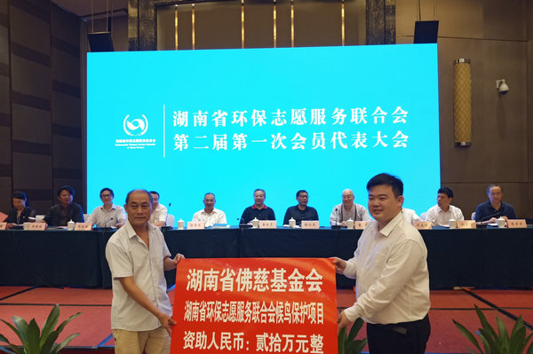 会上,湖南省环保联合会第一届会长何建军代表第一届理事会作工作报告,全面总结了联合会第一届的工作,并就联合会下一个五如何开展工作进行了谋划。会议通过了《湖南省生态保护志愿服务联合会(草案)》,选举了周秋光为湖南省环保志愿服务联合会第二届理事会会长,聘请了唐之享、张永忠、何真临、伍继延为联合会顾问,圣辉长老再次被礼请为名誉会长。第五届全国道德模范刘真茂、中国好人蒋科、全国最美生态志愿者张运和、湖南好人刘惟炳被聘为终身荣誉理事。会议对联合会第一届优秀会员进行了表彰,省佛慈基金会现场捐赠20万人民币用于候鸟保护项目。