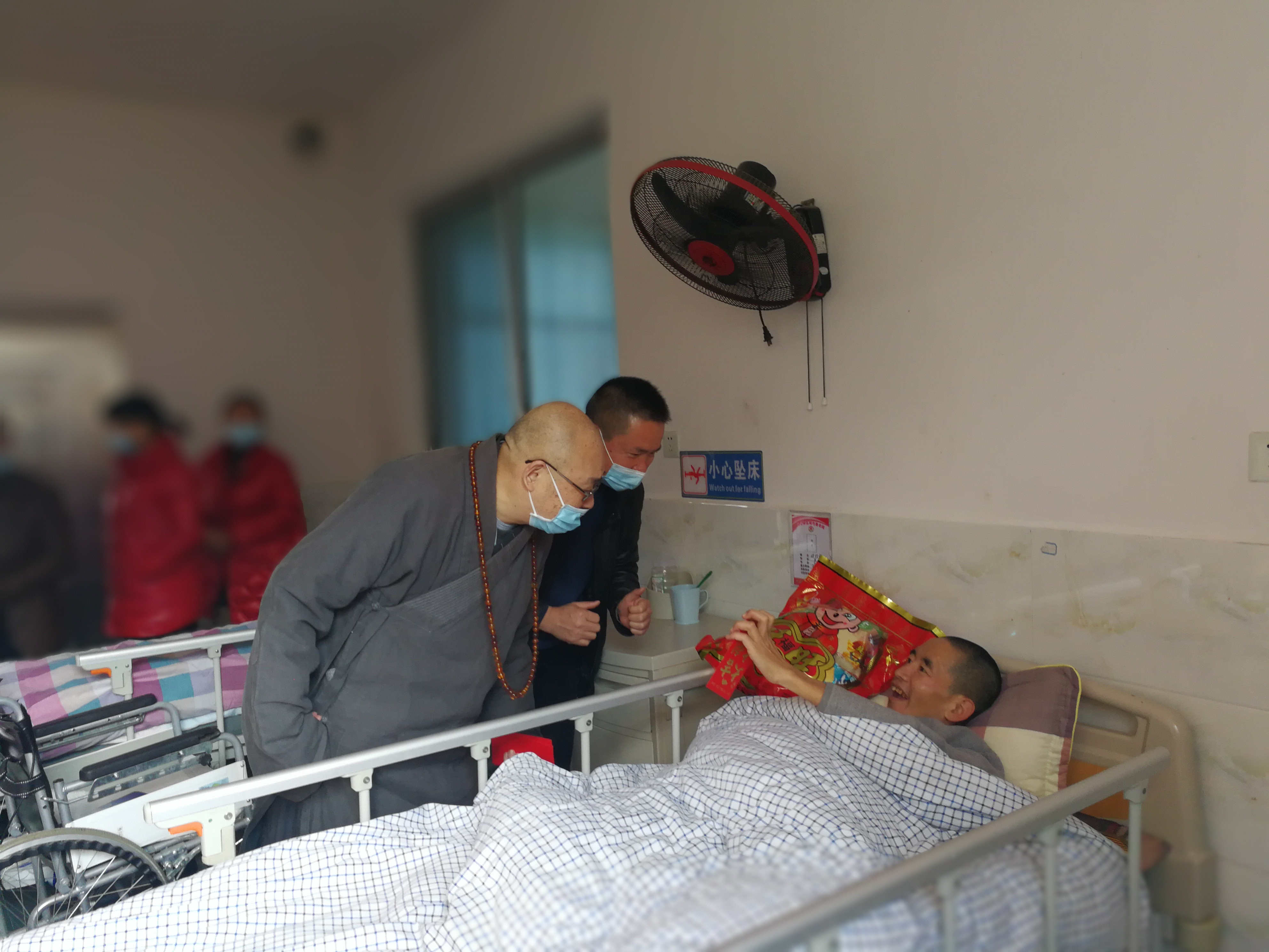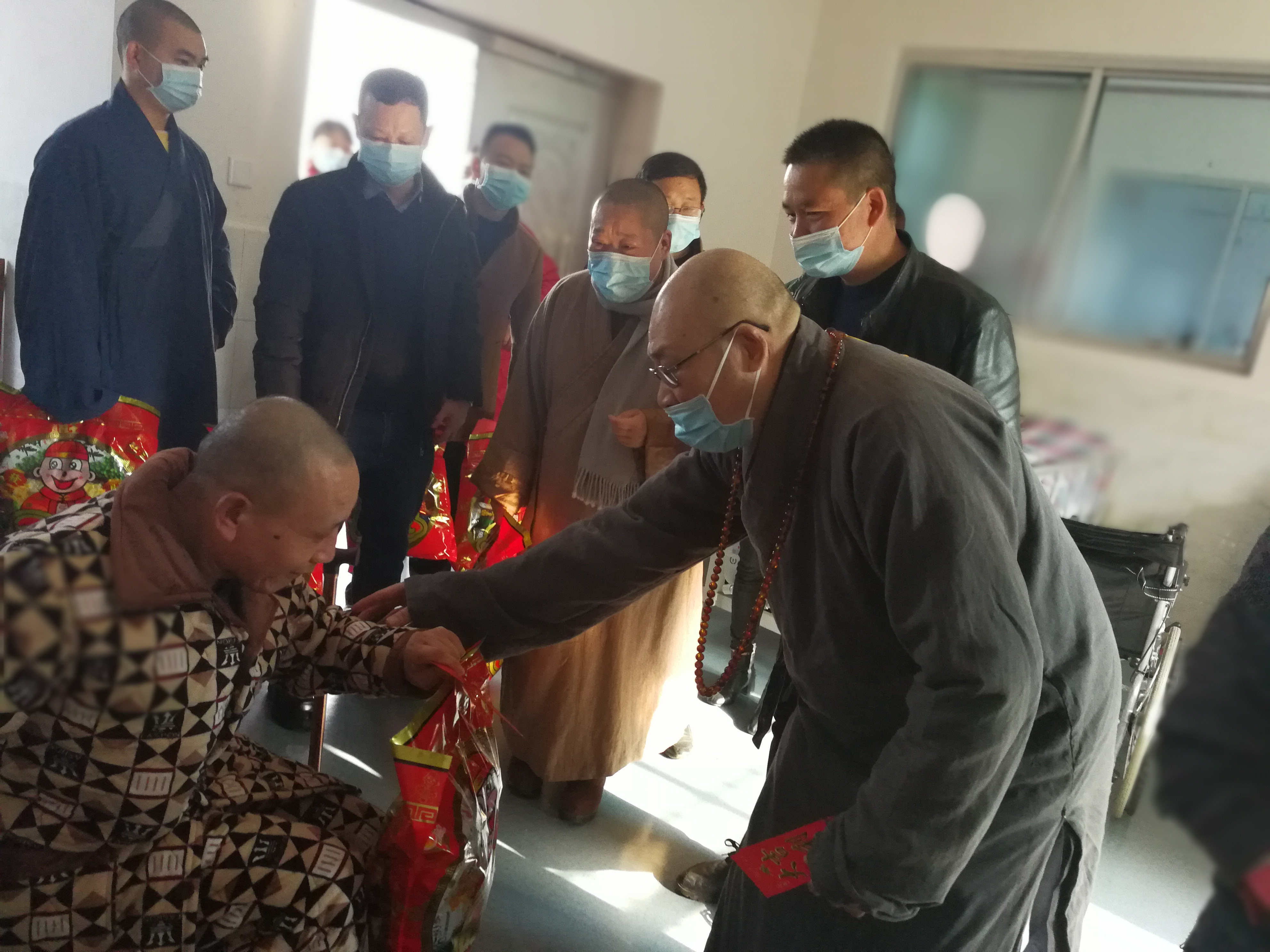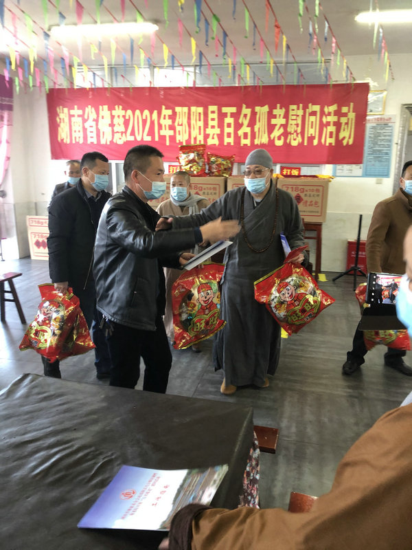 邵阳县民政局党组书记局长何伟才、民政局党组成员副局长陆志坚,陪同省佛慈基金会圣辉长老及工作人员一行,对敬老院百名孤残老人进行一一慰问。