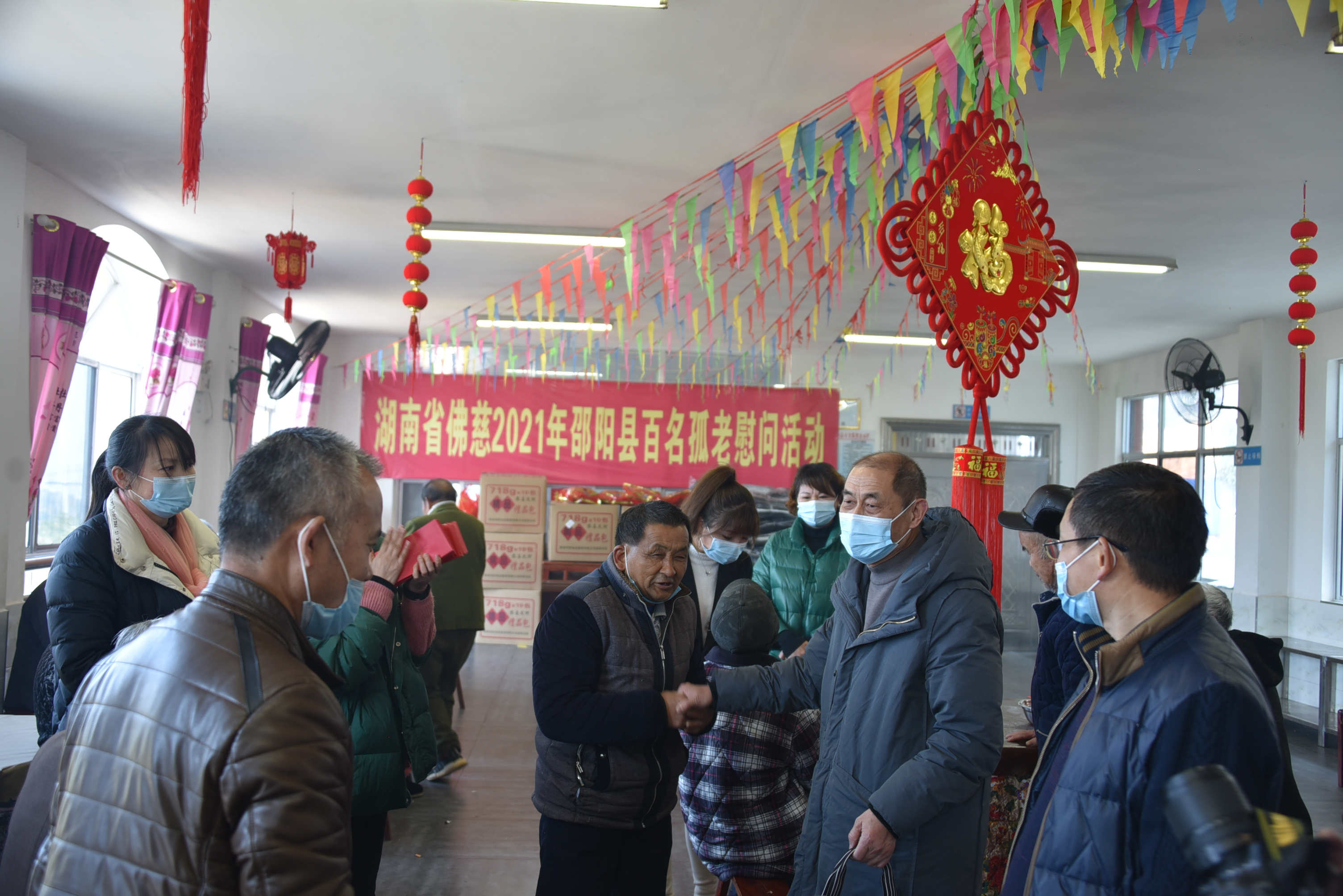 过年,最温暖的事情莫过于一家人围坐在一起吃上一顿年夜饭。带着新春祝福,带着对敬老院孤残老人的关切之情,2021年1月22日湖南佛慈基金会理事长圣辉长老一行在邵阳市民族宗教事务局副局长龚世喜、邵阳县统战部唐丁生副部长、邵阳市佛教协会会长志东法师、湖南省佛慈基金会秘书长周仲山的陪同下来到九公桥区域性敬老院。