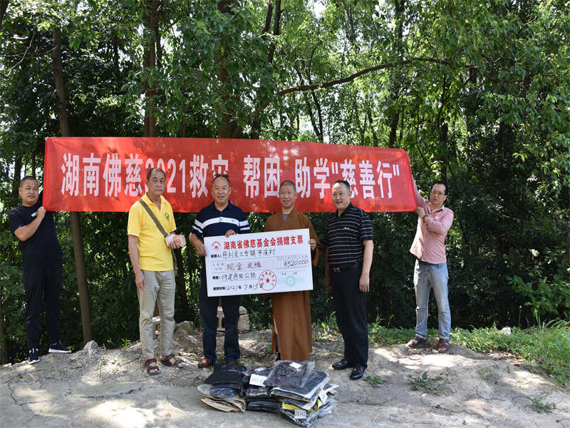 2021年7月15日,受基金会理事长圣辉长老委托,基金会副理事长怀泉大和尚率基金会工作人员赶到三合镇平溪村,湖南省佛慈基金会向慈利县三合镇平溪村捐助维修公路善款5万元。另捐赠新衣裤价值5000元。合计捐赠钱物5.5万元。