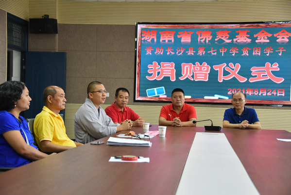2021年8月24日上午,湖南省佛慈基金会周仲山秘书长及工作人员一行人,受基金会理事长圣辉长老的委托,携带着社会爱心人士定向捐赠的善款,来到了位于千年古镇榔梨街道的长沙县第七中学。为今年毕业于该学校,各自考取了理想大学的5名困境学子,送去解燃眉之急的助学金。