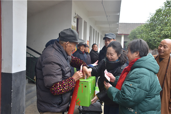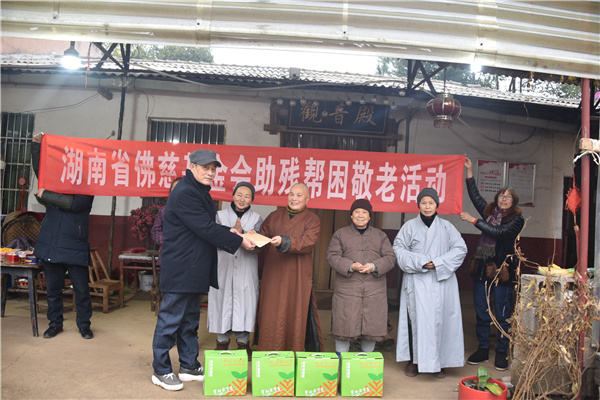 下午,在佛慈基金会秘书长周仲山的带领下,基金会工作人员继续前往湘阴县巡山寺,慰问了居住在该寺的5位年迈的僧尼师父,并奉送上慰问金5000元。
