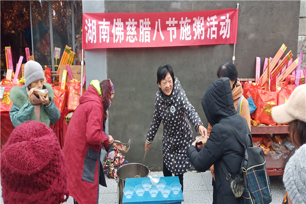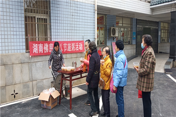 2022年1月10日“腊八”,在这个佛教界盛大的节日里,湖南省佛慈基金会在大门口设置了施粥点,以腊八施粥与信众结缘,吸引来了不少的路人、环卫工人和残障人士,大家喝着热气腾腾,香甜糯软的腊八粥,法喜充满的笑容挂在了每一个人的脸上。现代人也有一句话,叫作“施比受更有福”,施舍的同时,就种下了善的种子,这粒种子总有一天会生根发芽并长成参天大树。有幸吃到这腊八粥的人,也会因为得到了所有人以及佛的祝福而改变命运。在民间有“过了腊八就是年”的说法,今天之后,老百姓开始置办年货,各类庙会也开始操办起来,空气中“年味儿”渐浓。“腊”也意味着逐疫迎春和辞旧迎新,蕴含天人合一、敬畏自然的传统文化。