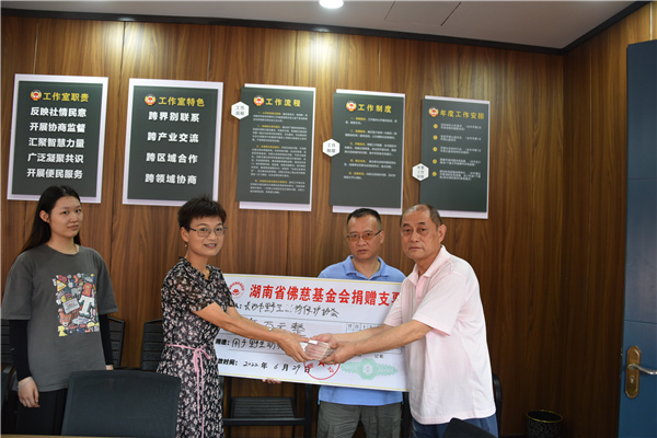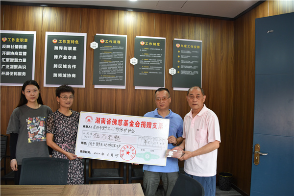 6月29日上午,受湖南省佛慈基金会理事长圣辉长老委托,秘书长周仲山、工作人员李东劲、李长辉前往长沙市野生动物保护协会,捐赠现金5万元。这也是湖南省佛慈基金会正式启动2022年救灾济困助学慈善行活动的第一站。