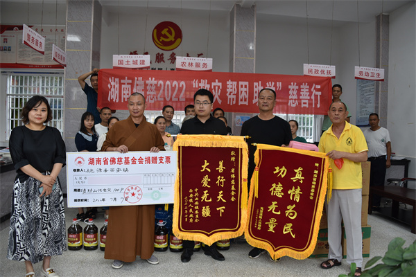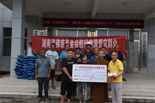 7月7日下午,受湖南省佛慈基金会理事长圣辉长老委托,秘书长周仲山及基金会工作人员一行前往桃源县夷望溪镇和西安镇,看望和慰问因山洪受灾的150户灾民。因受灾群众比较分散,并大雨不断,到达现场的部分灾民代表,在现场收到了爱心捐款和物资。本次活动捐赠了现金红包6万元,米油物资1.8万元以及新衣服价值1万元整,合计钱物捐赠捐赠8.8万元。参加捐赠的还有湖南省佛慈基金会秘书长周仲山;桃源县民宗局局长马朝辉;桃源县佛教协会副会长耀慧法师以及二镇及村部主要负责人。