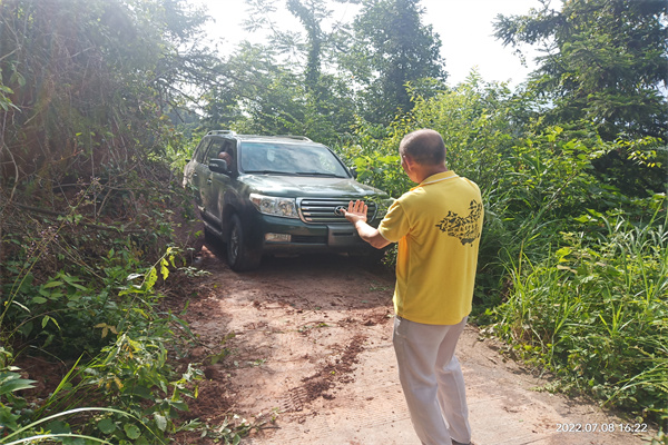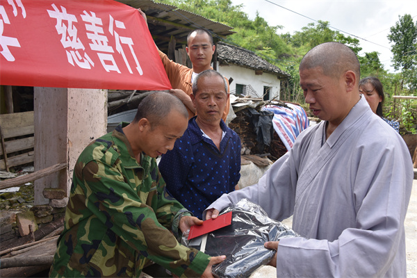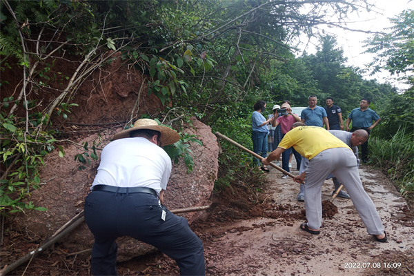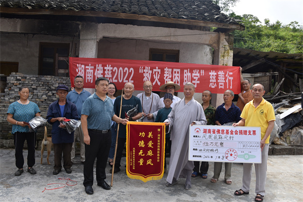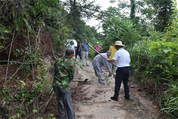 湖南省佛慈基金会理事长圣辉长老带领副理事长怀泉大和尚、秘书长周仲山等一行驱车前往远离城区的麻风村,离麻风村约300米距离时被因前期暴雨致山体滑坡的大石头挡住了。到村里借来锄头、开山斧等工具,怀泉大和尚带领基金会工作人员劈石头挖山土加宽路面,经过约20多分钟的努力,终于可以使车子通过了。