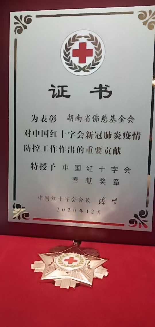 2023年春节过后不久,湖南省佛慈基金会就收到了,由中国红十字会陈竺会长亲自签署的“新冠肺炎疫情防控重要贡献奉献奖章”。这份崇高的荣誉,是对湖南省佛慈基金会三年来积极参与新冠疫情防控的最好见证和认可。必将激励湖南佛教界为社会公益慈善事业作出更多的功德。