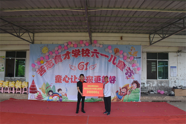 湖南省佛慈基金会受理事长圣辉长老的委托,在周仲山秘书长的带领下,前往学校参加了本次六一儿童节庆祝活动,并现场捐赠现金20万元、全新棒球棉马甲44件,体恤衫260件、小电风扇120个。