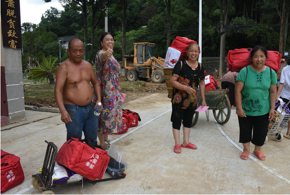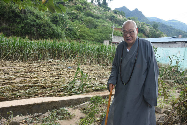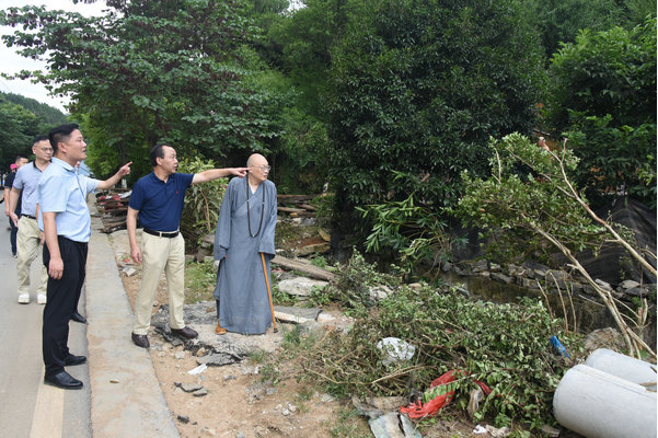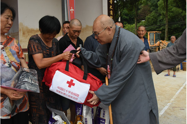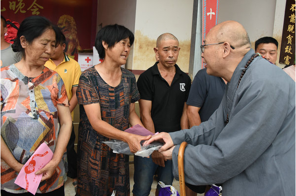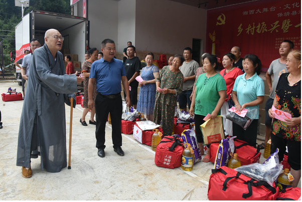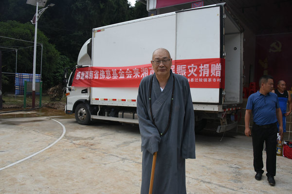 湖南省佛慈基金会理事长圣辉长老带领基金会常务副秘书长陈旭、工作人员李长辉及数名志愿者,在完成湘西古丈县古阳镇大龙村的赈济工作后。不顾受灾区路途多处存在的风险,又直接赶往位于湘西保靖县迁陵镇的茶市村。进入迁陵镇后,满眼都是原本马路上平整的沥青,像卷煎饼般被洪水冲刷得坑坑洼洼,沿途有的桥梁断裂、房屋倒塌,还有被洪涝侵袭后泥泞不堪的农田。圣辉长老一路上深感痛心疾首,心里更是担忧着受灾的老百姓,不断叮嘱随行人员,尽快前往指定的捐赠地点,不要让老乡们在烈日下久等。在捐赠现场,圣辉长老向受灾群众一一送上装有慰问金的信封,和满载着社会各界爱心人士深情的大米、食用油、新衣服。一位年迈的老奶奶接过圣辉长老亲手赠送的慰问金和赈济物资后,连日来因灾情倍感压抑的情绪更是倾泄而出,现场痛哭流涕,忍不住紧紧的拽住圣辉长老的衣袖,口中不断的嘟囔到“感谢你们!感谢你们!”。长老看到后不仅亲切的安慰,并不断嘱咐老人要相信在党和政府,积极开展灾后重建,幸福美好的生活一定会回来的。