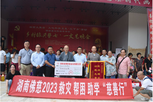 本次湖南省佛慈基金会捐赠的现金、大米、食用油、新衣物累计价值15万元,惠及受灾特别严重的困境家庭300户。于此同时,湖南省佛慈基金会联系州红十字会,将中国红十字会总会紧急下拨到湘西州灾区的救灾庭包送到赈灾点一起开展赈灾行动。参加本次捐赠活动现场的领导有湘西州人民政府副州长兼州公安局长周燕飞、州委统战部副部长田滔、保靖县副县长胡泽钊,县委统战部常务副部长吴天宇,县民政局长梁科,迁陵镇党委书记胡明。