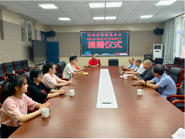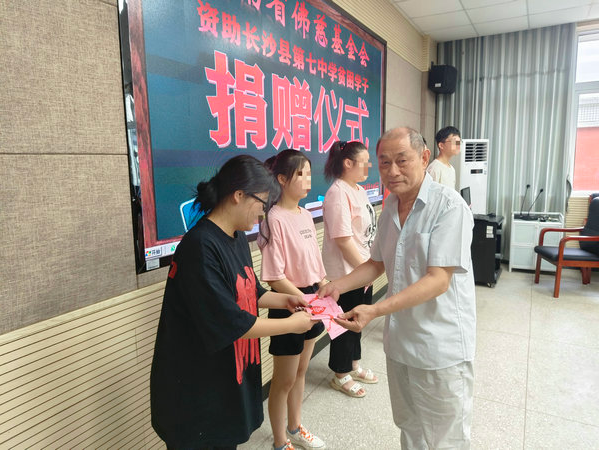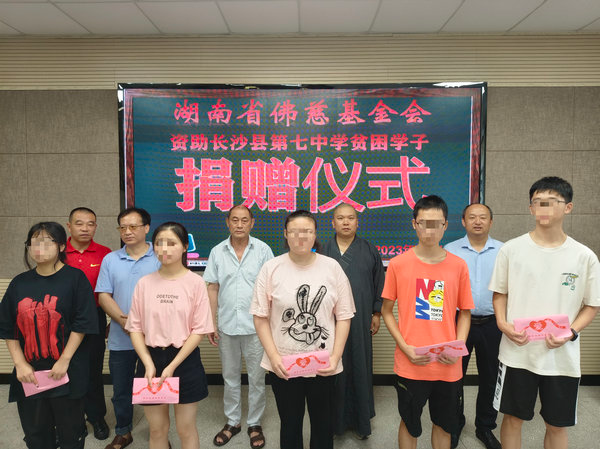 8月12日上午,受省佛慈基金会理事长圣辉长老的委托,省佛慈基金会周仲山秘书长、省佛协办公室副主任通振法师,省佛慈工作人员李东劲、李长辉等一行人,在长沙县七中小会议室举行2023年“金秋助学”资助金发放仪式,为考入大学的7名困难家庭子女发放助学金2.1万元。