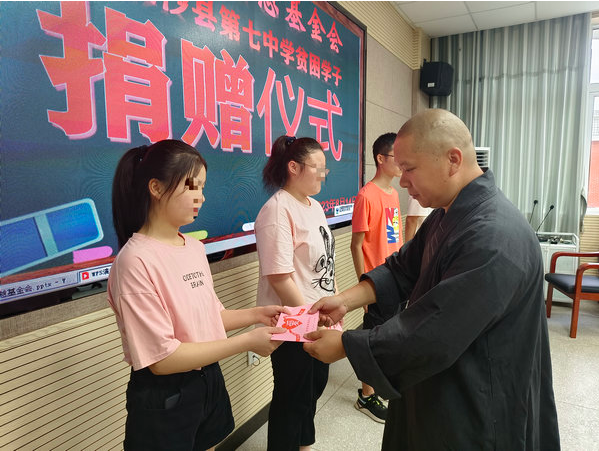 在资助仪式上周仲山秘书长和通振法师希望受助学生要胸怀大志,自立自强,在今后的学习和生活中以优异的学习成绩和成熟的世界观,实现最大的社会价值。长沙县七中校长郭帅、副校长范宏亮参加捐赠仪式。