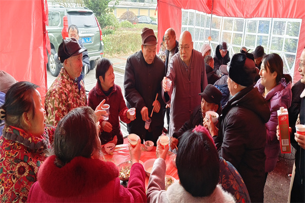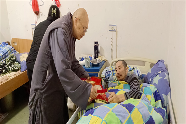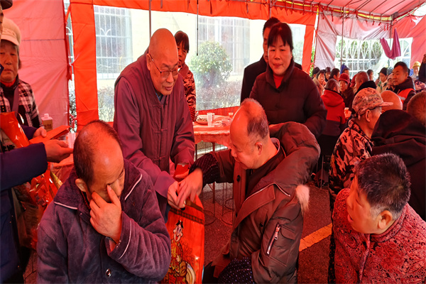 2024年1月29日,圣辉长老风尘仆仆的赶到敬老院,在湘潭统战部民宗科刘顶夫科长,雨湖区委统战部副部长兼民宗局范双双局长,湖南省佛协会副会长、湘潭市佛协会长渊博法师,湖南省佛协副会长、省佛慈基金会秘书长周仲山居士陪同下,来到今年看望慰问百名老人的活动现场--湘潭姜畲镇敬老院,奉上春节慰问金、新棉衣和节日大礼包,并和百名孤老一起喜气洋洋的围桌而坐,提前吃团年饭,与省佛慈基金会工作人员共同祝福老人们晚年幸福、福寿康宁,笑口常开。